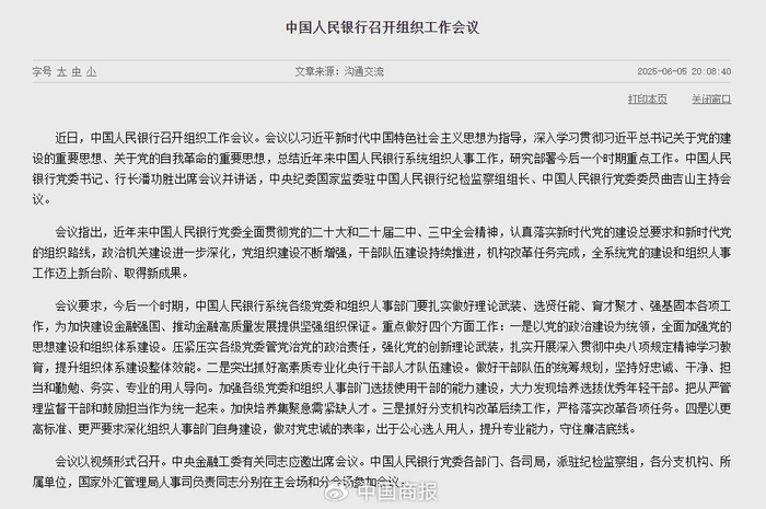值得一提的是,央行近日召开组织工作会议,总结近年来中国人民银行系统组织人事工作,研究部署今后一个时期的重点工作。