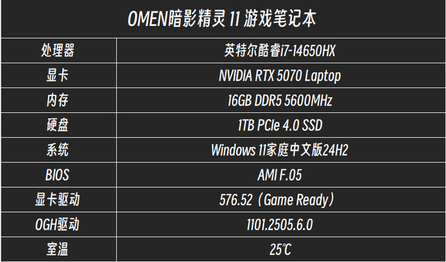 OMEN暗影精灵11游戏笔记本的综合素质非常给力,个人总结其拥有四个非常明显的优势。第一,i7-14650HX搭配RTX 5070 Laptop,以及170W+的性能释放,其性能表现在相近价位或者相似配置的机型中,是比较出色的;第二,散热表现不错,极限压力测试下,无论是处理器还是显卡,温度控制比较给力;第三,屏幕素质依旧很能打,2.5K+240Hz+实测超高亮度,在相近价位中很有优势;第四,质价比在一线品牌中很高,RTX 5070 Laptop机型国补后到手价不到7000元,非常吸引人。所以说暗影精灵11是一款质价比和性价比都非常出色的游戏本,素质全面,价格亲民,是此次618非常值得关注的游戏本产品。