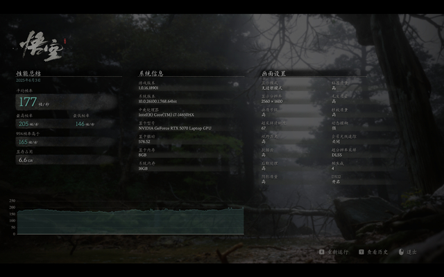 首先是国产之光《黑神话:悟空》,在DLSS质量+DLSS 4 4倍多帧生成设置下,游戏内置Benchmark的成绩为平均177帧,流畅度比较给力。
