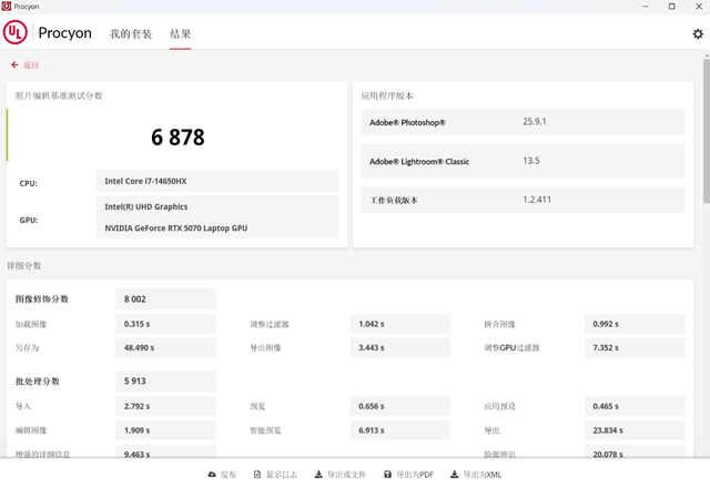 创作性能方面,我进行了照片编辑(Ps、Lr)和视频剪辑(Pr)测试,在UL Procyon的照片编辑测试中,暗影精灵11得到6878分的成绩,这意味着它在处理照片的时候,效率非常高,足以满足摄影师、平面设计师的需求。视频剪辑测试中,暗影精灵11得到34545分的成绩,比较出色,可以应对4K视频的剪辑渲染工作。