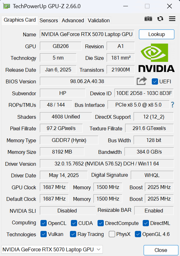 RTX 5070 Laptop是近期出现频率比较高的显卡,其基于NVIDIA Blackwell架构,支持DLSS 4的全部特性,包括最高4倍的多帧生成。其拥有4608个CUDA核心,核心频率1687MHz。Boost频率2025MHz;显存为8GB GDDR7,来自海力士,位宽为128bit,显存频率1500MHz。该卡为115W满功耗版。