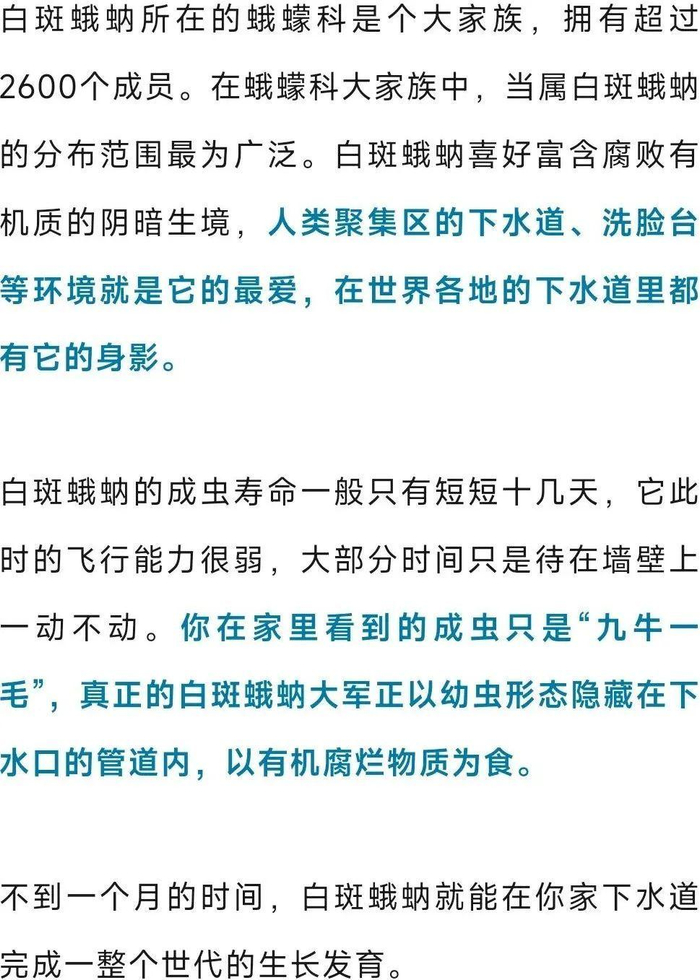 这样看来,偶尔从下水管道飞出来的白斑蛾蚋,除了招人烦,没啥实质性的大危害。