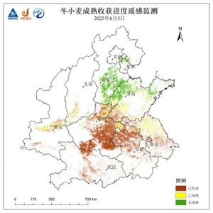 据农业农村部农情调度及国家卫星气象中心FY-3D卫星遥感监测,截至6月5日,全国冬小麦收获进度为52.32%。河南近八成半,江苏、陕西近四成半,山西近两成,山东过一成半(图1);安徽夏播过五成,河南过六成,陕西过两成。