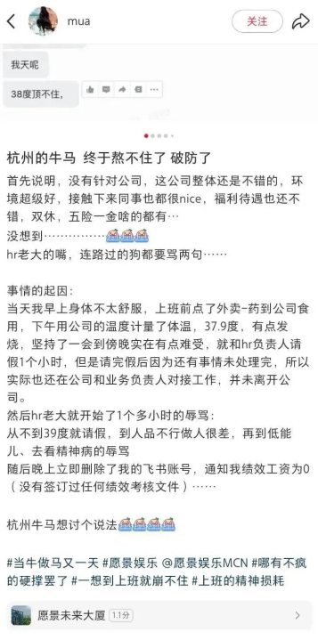 愿景娱乐员工发烧37.9度请假,反被HR辱骂“该看精神科”?公司回应
