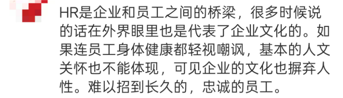 对此,大部分网友认为这位HR的言论过激,连基本的人文关怀都不能做到。