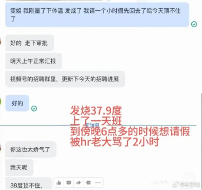 6月5日上午,据相关资料显示,有网友发文吐槽某公司HR称,其发烧37.9度向HR负责人请假1小时,但请完假后因有事未处理完,所以实际还在公司和业务负责人对接工作,并未离开公司,结果却遭到对方近2小时的辱骂。