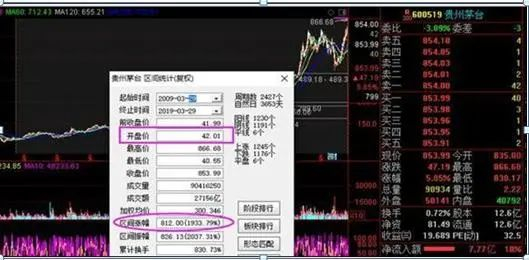 从上图可以得知贵州茅台总涨幅位1933.79%后股价变为812元;