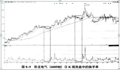 如图8-9所示,卧龙电气(600580)在被主力拉升的过程中,股价也曾经历过打压的过程。对于主力深度介入其中的股票来说,在主力打压洗盘时,一定是散户在大量的出货。既然主力不参与出货,那么换手率一定不会很高。与拉升阶段主力不断拉抬股价不同的是,打压股价的换手率是萎缩的。图中在卧龙电气这只股票的两个洗盘位置中,其换手率都呈现出了萎缩的状态。这正好说明了主力在打压股价时惜售股票,印证了主力在该股中的存在。