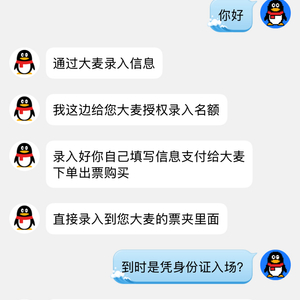 按照对方的要求,陈欣欣通过QQ添加了对方的联系方式。“代购说他有大麦网授权录入名额的渠道,只要我填写个人购票信息,支付给大麦网下单出票,门票就可以直接录入我的大麦网票夹里。”陈欣欣称,对方多次强调票钱是直接付给大麦网,等票到后才需要支付100元手续费。