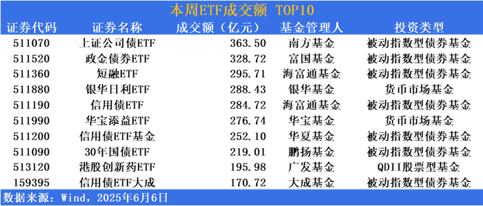 成交额方面,上证公司债ETF(511070)周成交额达363.50亿元,位居榜首。政金债券ETF(511520)、短融ETF(511360)成交额分别为328.72亿与295.71亿紧随其后,债券类基金依旧是场内交易重点。