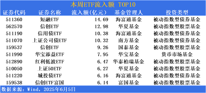 具体资金流入方面,当前主线为明,资金观望态势明显,叠加利率下行影响,资金整体风格趋向保守,债券ETF成为流入主力,本期(2025年6月3日-6月5日)内,短融 ETF(511360)流入超14亿,位居榜首。信用债ETF(511190)、上证公司债ETF(511070)等多只债券ETF资金流入居前。
