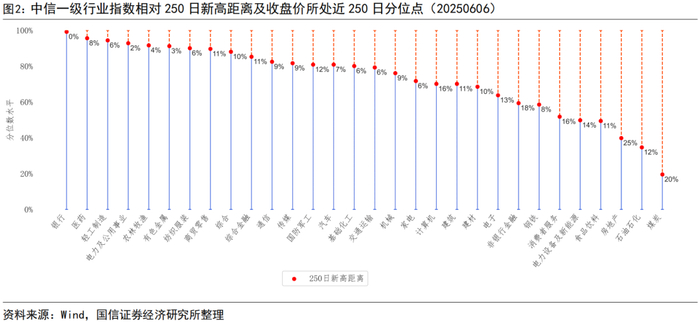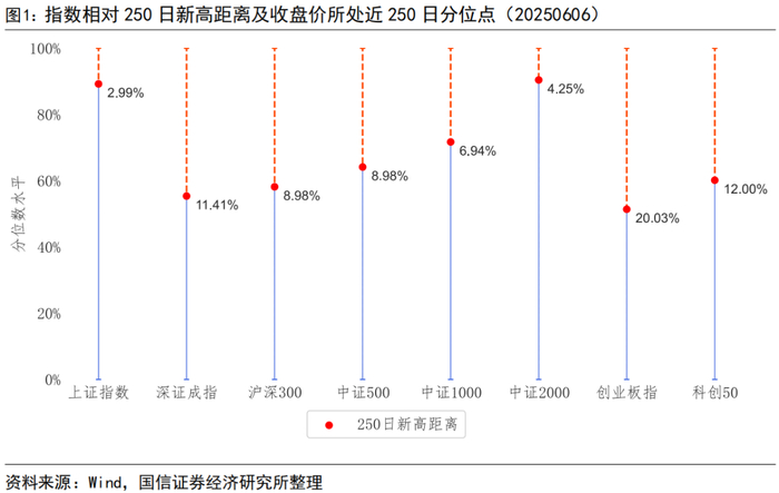 截至2025年6月6日,上证指数、深证成指、沪深300、中证500、中证1000、中证2000、创业板指、科创50指数250日新高距离分别为2.99%、11.41%、8.98%、8.98%、6.94%、4.25%、20.03%、12.00%。中信一级行业指数中银行、医药、轻工制造、电力及公用事业、农林牧渔行业指数距离250日新高较近,煤炭、石油石化、房地产、食品饮料、电力设备及新能源行业指数距离250日新高较远。概念指数中,万得微盘股日频等权、数字货币、银行、银行精选、万得全A等权、创新药等概念指数距离250日新高较近。
