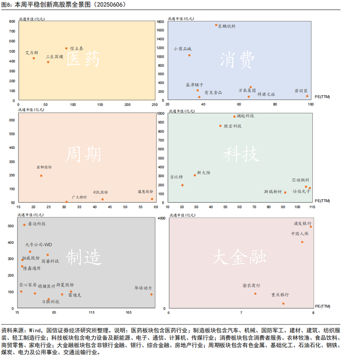 我们根据分析师关注度、股价相对强弱、趋势延续性、股价路径平稳性、创新高持续性等角度,本周从全市场创新高股票中筛选出了包含三生国健、万辰集团、仕佳光子等38只平稳创新高的股票。按照板块来看,创新高股票数量最多的是制造、消费板块,分别有11、8只入选。其中,制造板块中创新高最多的是机械行业;消费板块中创新高最多的是食品饮料行业。