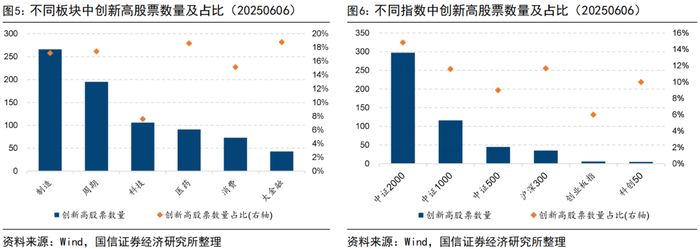 截至2025年6月6日,共777只股票在过去20个交易日间创出250日新高。其中创新高个股数量最多的是基础化工、机械、医药行业,创新高个股数量占比最高的是银行、纺织服装、轻工制造行业。按照板块分布来看,本周制造、周期板块创新高股票数量最多;按照指数分布来看,中证2000、中证1000、中证500、沪深300、创业板指、科创50指数中创新高个股数量占指数成份股个数比例分别为:14.85%、11.60%、9.00%、11.67%、6.00%、10.00%。