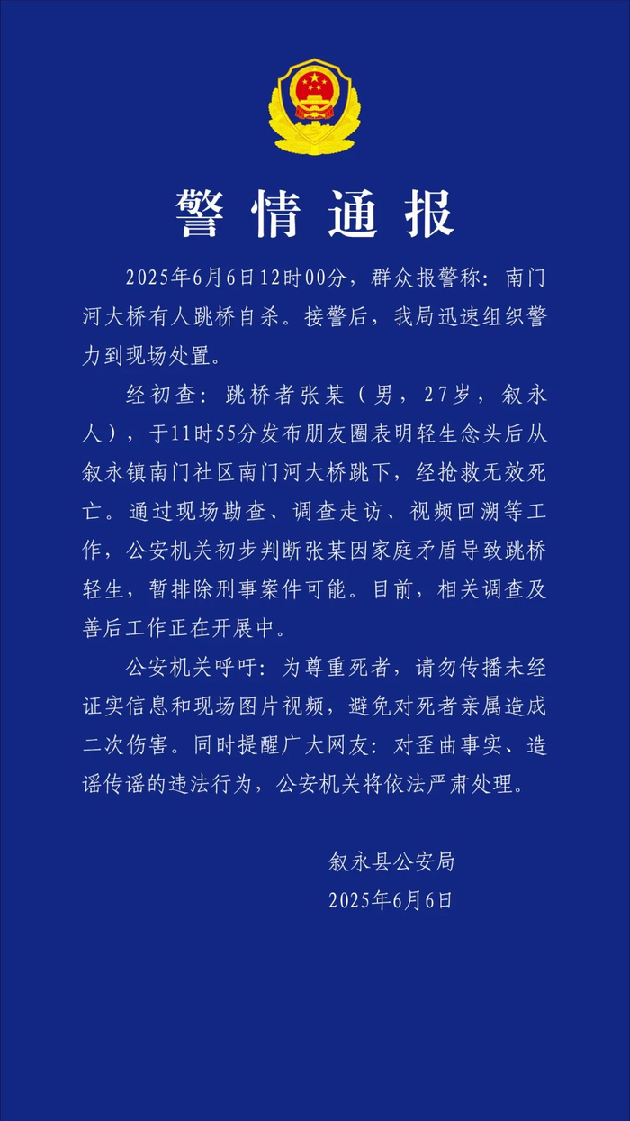 经初查:跳桥者张某(男,27岁,叙永人),于11时55分发布朋友圈表明轻生念头后从叙永镇南门社区南门河大桥跳下,经抢救无效死亡。通过现场勘查、调查走访、视频回溯等工作,公安机关初步判断张某因家庭矛盾导致跳桥轻生,暂排除刑事案件可能。目前,相关调查及善后工作正在开展中。
