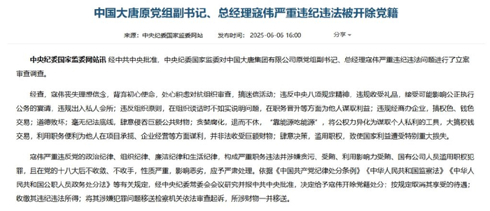 中国大唐原党组副书记、总经理寇伟严重违纪违法被开除党籍。