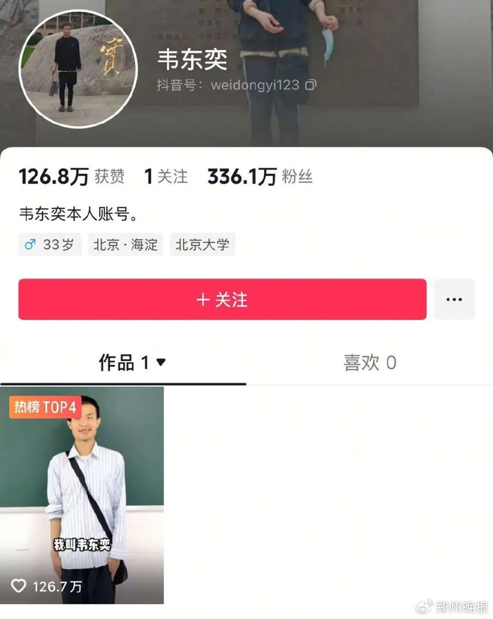 6月4日,现正在北京大学任教的韦东奕老师,网友熟悉的“韦神”发布视频和网友打招呼。亲属证实称,是他本人,会用来做数学分享,希望他多接触外界。截至6日18时34分,该账号粉丝已达336.1万。而评论区成网友的“许愿池”:“接高考数学130+”“希望高考超常发挥,考到韦神的学校(北大)”等。