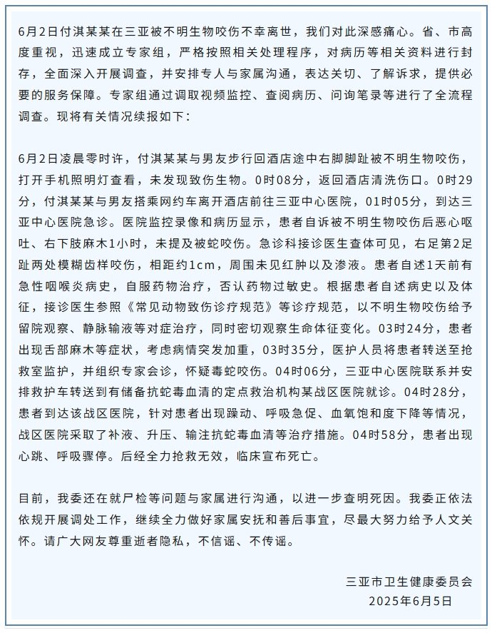 27岁女游客被不明生物咬伤身亡,三亚市卫健委6日凌晨再通报,公布救治过程。