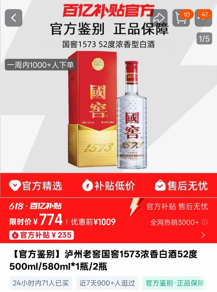 从终端价格上就能看出端倪,据“今日酒价”统计,52度/500毫升的国窖1573当前的批发价在845元/瓶,低于980元/瓶的出厂价格。在电商平台上,补贴后仅需774元就能拿下,比出厂价更是大降21%,已经跌入次高端价位段了。