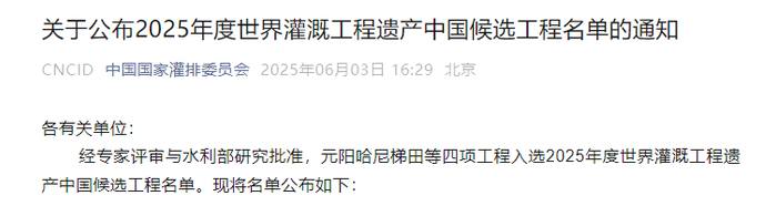 近日,2025年度世界灌溉工程遗产中国候选工程名单正式揭晓,全国仅有4个入选,分别为:云南元阳哈尼梯田、江苏赤山湖灌溉工程、四川湔江堰、北京门头沟永定河古渠灌溉工程。云南元阳哈尼梯田榜上有名。