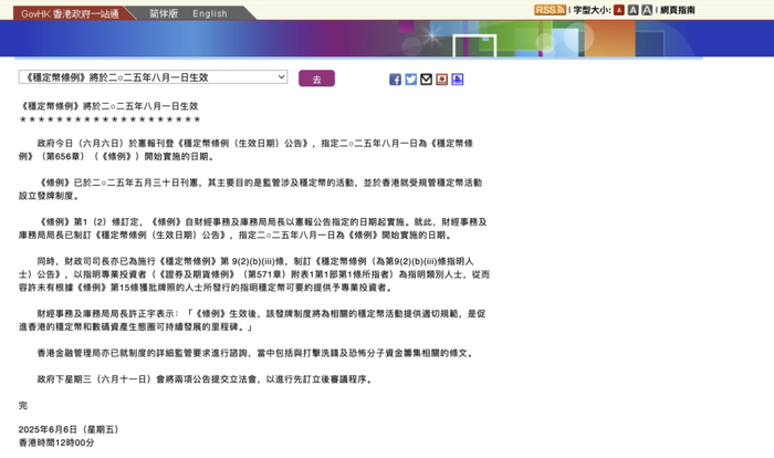 香港特区政府6月6日于宪报刊登《稳定币条例(生效日期)公告》,指定2025年8月1日为《稳定币条例》(第656章)(以下简称《条例》)开始实施的日期。《条例》于今年5月30日刊宪,其主要目的是监管涉及稳定币的活动,并于香港就受规管稳定币活动设立发牌制度。