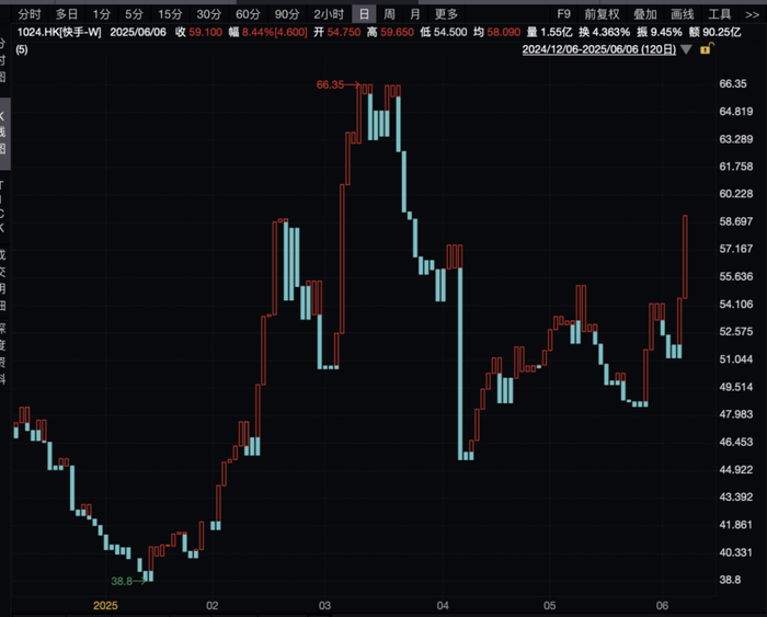 6月6日,快手-W上涨8.44%,报收于59.1港元/股。