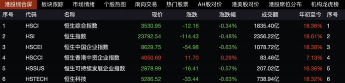 6月6日,港股三大指数震荡走低。截至收盘,恒生指数跌0.48%,报23792.54点;恒生科技指数跌0.63%,报5286.52点;恒生国企指数跌0.63%,报8629.75点。全日大市成交额为2356.22亿港元,南向资金净买入额为67.66亿港元。