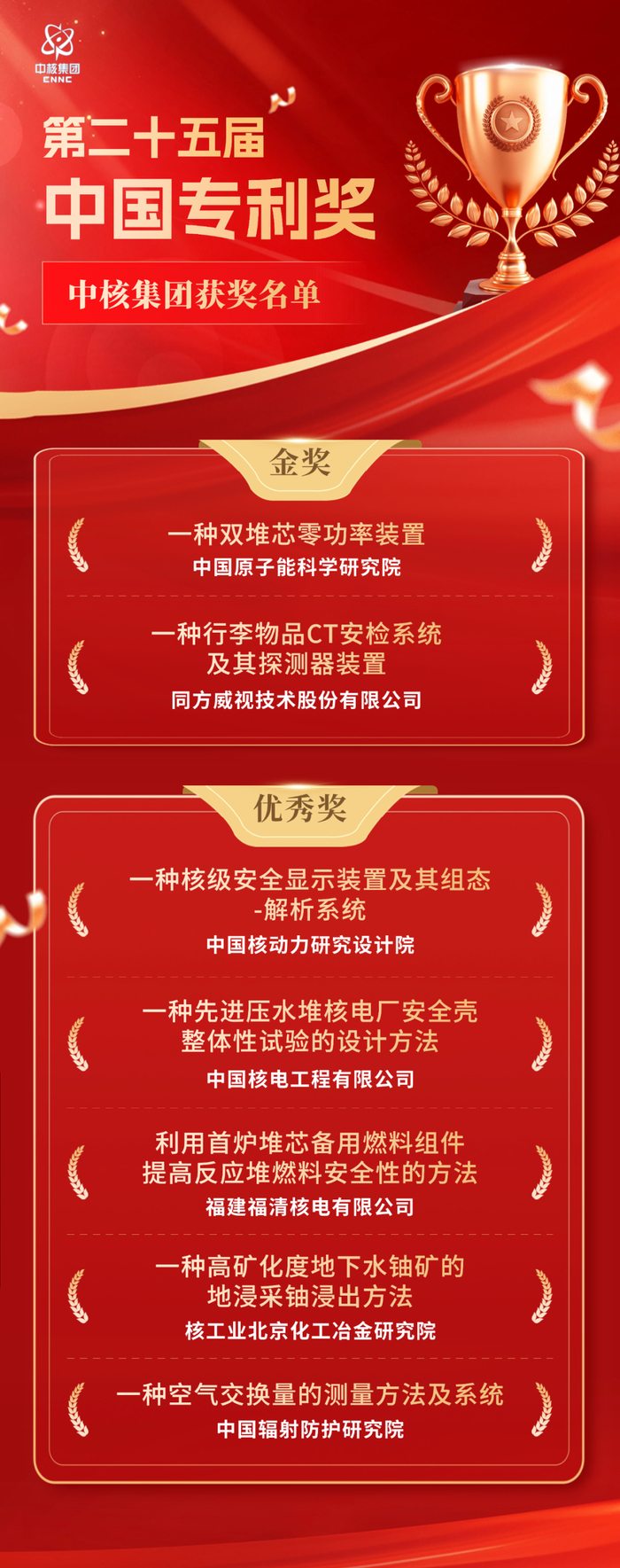 6月5日,国家知识产权局正式发布《关于第二十五届中国专利奖授奖的决定》,中核集团凭借前瞻性的知识产权战略布局和追求卓越的技术创新能力,一举斩获2项专利金奖和5项专利优秀奖。此次获奖标志着中核集团继2021年首次问鼎中国专利金奖后,在科技创新领域再创佳绩,首次实现单届双金奖的历史性突破,充分展现了集团公司在核工业领域的核心竞争力和杰出创新实力。