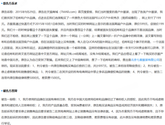 此外,清流工作室注意到,伯希和也曾因对品牌背景虚假宣传被起诉。在2017年公布的一则判决书中提到,原告(消费者)称于天猫商城购买了伯希和品牌的户外软壳衣,该商品被宣传为“法国高端户外品牌”,但其产地却是北京;