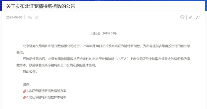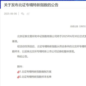 将于2025年6月30日正式发布北证专精特新指数,为市场提供多维度投资标的和业绩基准。