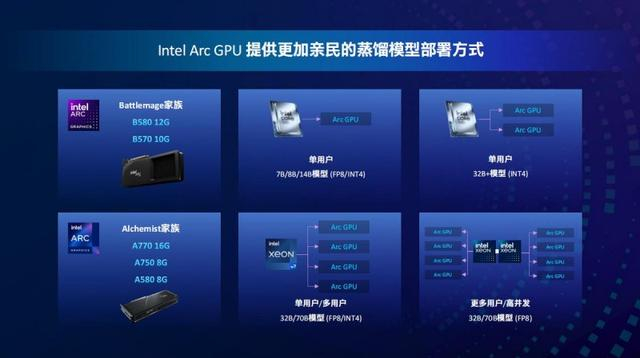 在这方面,英特尔Arc系列GPU能够提供灵活的解决方案。其中英特尔Alchemist产品家族(比如A770 16GB、A750 8GB)主要适合单用户/多用户进行32B /70B大模型的部署;英特尔Battlemage产品家族(比如B580 12GB、B570 10GB)主要针对7B/14B大模型进行优化,能够提供更加亲民的部署选择。