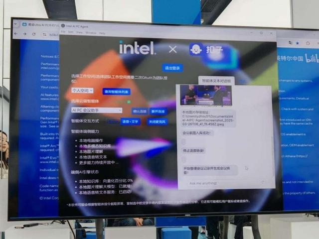 首先是英特尔联合扣子推出的一系列AI功能体验。在这个过程中,英特尔平台利用扣子本身开放端插件的能力把AI PC本地的一些功能,比如PC操控、RAG以及PC语音等融入扣子Agent flow开发流程中,为用户提供全新的端云结合的新体验。英特尔在现场主要展示了其中的AI PC会议助手功能。