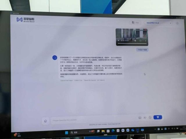 面壁智能开发的迷你CPMV2-6是一个8B的视觉大模型,可以对图像和视频做理解和分析。在现场演示中,向系统导入一个大熊猫拿起旁边竹篮的视频之后,系统能够准确总结出视频的主要内容。