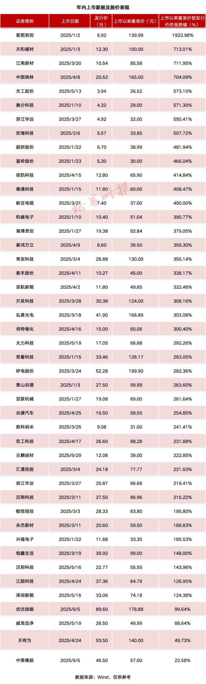 2025年以来,A股市场新股上市后总体表现较好,逾六成新股上市以来的最低价亦较发行价翻倍,而若按照上市以来最高价计算,则有超过九成新股股价曾较发行价翻倍。