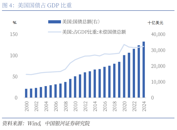 疲弱的美债以及不能停歇的美国财政扩张互相交织,最终会迫使美联储再次QE,带来弱势美元,从而形成负反馈。美债2024年超36万亿美元(美国名义GDP约30万亿美元),美债的发行增速持续高于GDP增速,美国政府债务占GDP比重已经达到121.5%。美国的联邦利息支出/GDP比例在2035年也将超过4%,2050年将达到5%,超过名义GDP的增速。2025年OBBB法案公布内容来看,特朗普政府大规模减税可能在下半年到来。美国尽责联邦预算委员会(CRFB)数据显示2027年美国赤字上行至2.3万亿美元,超过2024年白宫预算法案显示的财政赤字。特朗普政府在2025年履任以来推行了“特朗普版门罗主义”,对全球开启“对等关税”贸易战,全球资本市场动荡,各国政府及投资者对美国的信心回落。海外投资者参与美债交易比例下行趋势如果不变,那么未来美联储重启QE会是最终的选择,这会削弱美元。