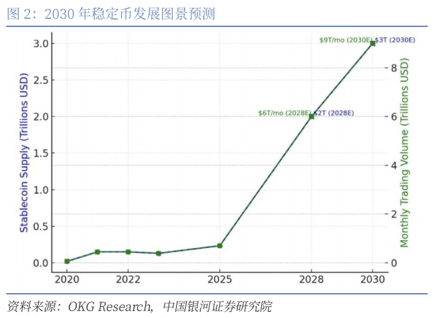 稳定币发展迅速,但仍然处于爆发的早期。2020年初,所有稳定币总市值不足60亿美元,截至2021年末,稳定币总市值增长了近25倍至1520亿美元。据区块链数据机构OKG Research统计,2025年首季链上清算规模突破3.7万亿美元,年化交易量预计突破9.8万亿美元。OKG Research预计,乐观情况下,到2030年全球稳定币供应量达到3万亿美元,每月链上交易量可能达到9万亿美元,每年交易量可能超过100万亿美元。这类数字资产将超越传统电子支付系统,成为全球清算网络的底层资产,规模或成为全球第四大基础货币。