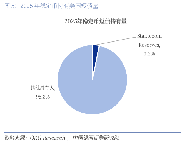 稳定币储备资产正成为新的需求,未来稳定币储备会成为美国债券最大的持有者之一。OKG Research数据显示,当前稳定币持仓已经占据美债短期票据市场的3%。《GENIUS法案》规定美元稳定币的抵押品需要全额美元资产。OKG Research预计当美元稳定币市场扩展至3万亿美元,仅合规配置需求就将产生1.5万亿美元的美债持有量,规模接近中、日等主权国家投资者持仓水平。