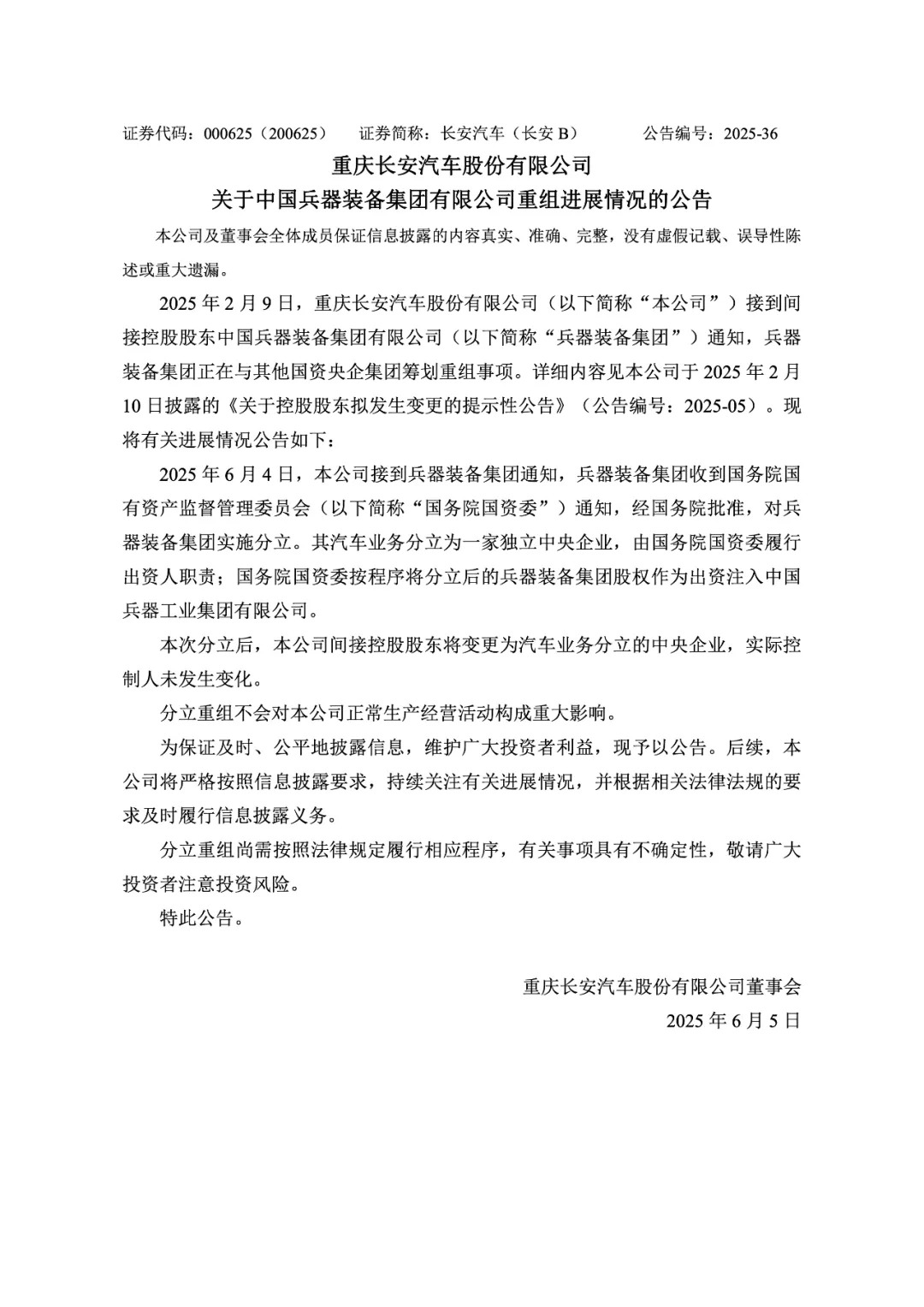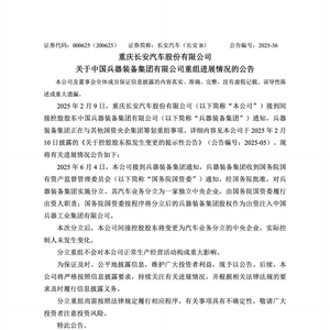6月4日,重庆长安汽车股份有限公司(简称“长安汽车”)接到兵器装备集团通知,兵器装备集团收到国务院国资委通知,经国务院批准,对兵器装备集团实施分立。其汽车业务分立为一家独立中央企业,由国务院国资委履行出资人职责;国务院国资委按程序将分立后的兵器装备集团股权作为出资注入中国兵器工业集团有限公司。