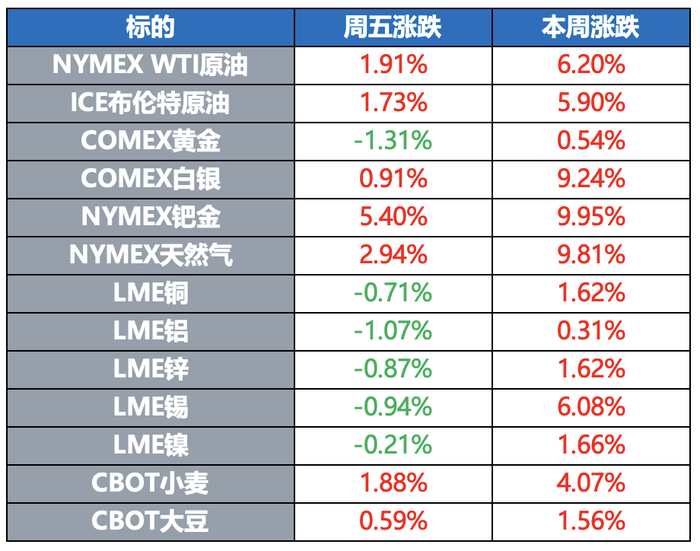 COMEX黄金期货收跌1.31%,报3331美元/盎司,本周累计上涨0.54%。COMEX白银期货收涨0.91%,报33331美元/盎司,本周累计上涨9.24%。