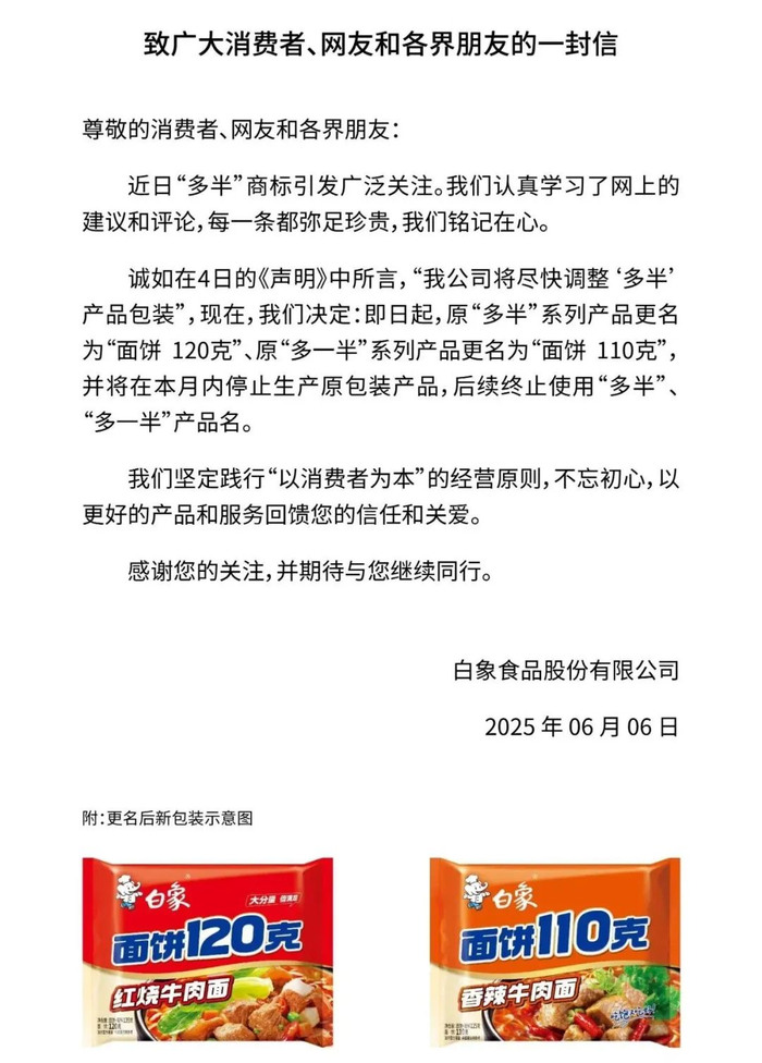6月6日晚,白象食品发布公开信称,决定即日起,原“多半”系列产品更名为“面饼 120克”、原“多一半”系列产品更名为“面饼 110克”,并将在本月内停止生产原包装产品,后续终止使用“多半”、“多一半”产品名。(澎湃新闻)