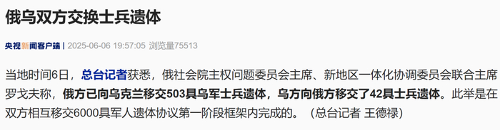 【俄乌双方交换士兵遗体】当地时间6日,总台记者获悉,俄社会院主权问题委员会主席、新地区一体化协调委员会联合主席罗戈夫称,俄方已向乌克兰移交503具乌军士兵遗体,乌方向俄方移交了42具士兵遗体。此举是在双方相互移交6000具军人遗体协议第一阶段框架内完成的。(央视新闻)