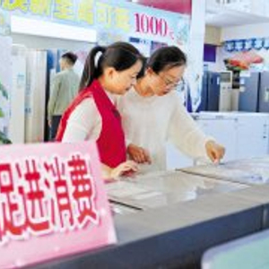 “3C产品补贴15%”“家电家装厨卫补贴20%”……走进山东省泰安市的三源家电线下卖场,多则关于以旧换新的标识映入眼帘,不少顾客在柜台前咨询。