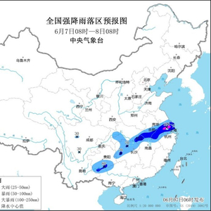 预计,6月7日08时至8日08时,湖北东部和南部、安徽中南部、江苏南部、上海、湖南西部和北部、江西北部、浙江西部和北部、贵州东部和南部、广西西北部等地部分地区有大到暴雨,其中,江苏南部等地局地有大暴雨(100~150毫米)。上述部分地区伴有短时强降水(最大小时降雨量30~60毫米,局地可超过80毫米),局地有雷暴大风等强对流天气。中央气象台6月7日06时继续发布暴雨蓝色预警(见图1)。