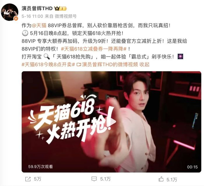 从《厉总,你找错夫人了》到《坠入春夜》的霸总专业户曾辉近半年也拓展了不少高质量的品牌商务:4月成为美妆品牌小奥汀品牌星推官之后,5月又被官宣为天猫618福利官,与黄龄、武艺共同出现在地广当中。