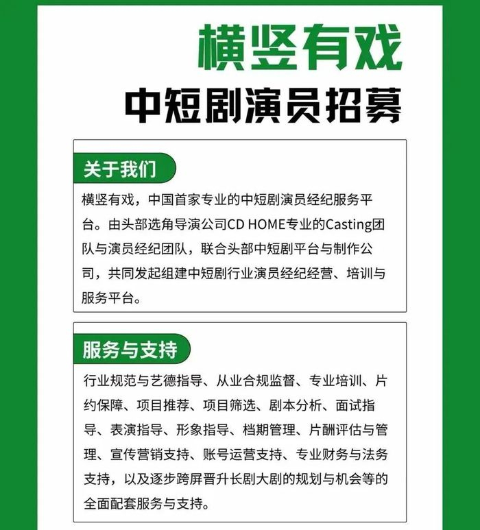 内容行业进行到一定阶段会出现更具体的分工。今年2月,「横竖有戏」作为长剧头部选角团队CDHOME旗下专门面向短剧赛道的新部门,从演员经纪出发,摸索更专业的流程,向短剧行业输送更多专业的力量。CDHOME的联合创始人毕英杰则成为横竖有戏的负责人。
