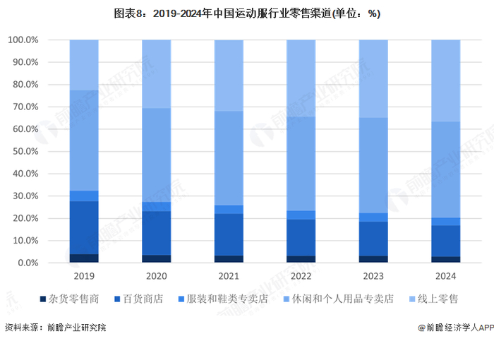 近年来,我国运动服市场零售渠道构成变化显著。线上零售占比从2019年的22.4%一路攀升至2024年的36.6%,成为增长最快的渠道。百货商店渠道占比持续下滑,从23.7%降至14.0%。休闲和个人用品专卖店一直是重要渠道,占比稳定在42%左右。服装和鞋类专卖店及杂货零售商占比较低且波动较小。整体来看,线上零售发展迅猛,传统线下渠道占比有所下降,市场逐步向线上转移。