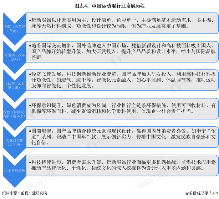 3、 行业发展历程:未来中国运动服行业向智能化、个性化以及文化内涵丰富的方向发展