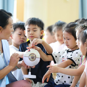 2025年6月5日,在河北省石家庄市华北幼儿园,健康老师为孩子们讲解眼球结构。新华社发(梁子栋摄)
