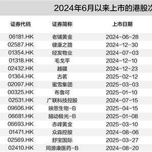 Wind的统计显示,自2024年6月7日至2025年6月6日这一年间,港股市场总共有76只新股上市,其中有45只股价较发行价上涨,占比约为六成,这与前几年新股上市后仅约三成高于发行价不同。值得一提的是,这76只上市不到一年的次新股中明星股辈出,总共有14只股票上市后股价已经翻番,其中老铺黄金、健康之路、经发物业、毛戈平和越疆等5只股票目前股价较发行价涨幅超过2倍。