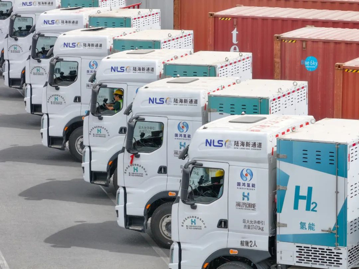 资料图片:4月14日,西部陆海“氢走廊”正式投运。这条西部陆海“氢走廊”始于重庆,最终抵达广西钦州港,全程约1150公里,中途设有4座加氢站。图为氢能重卡在陆海新通道重庆无水港等候发车。 新华社